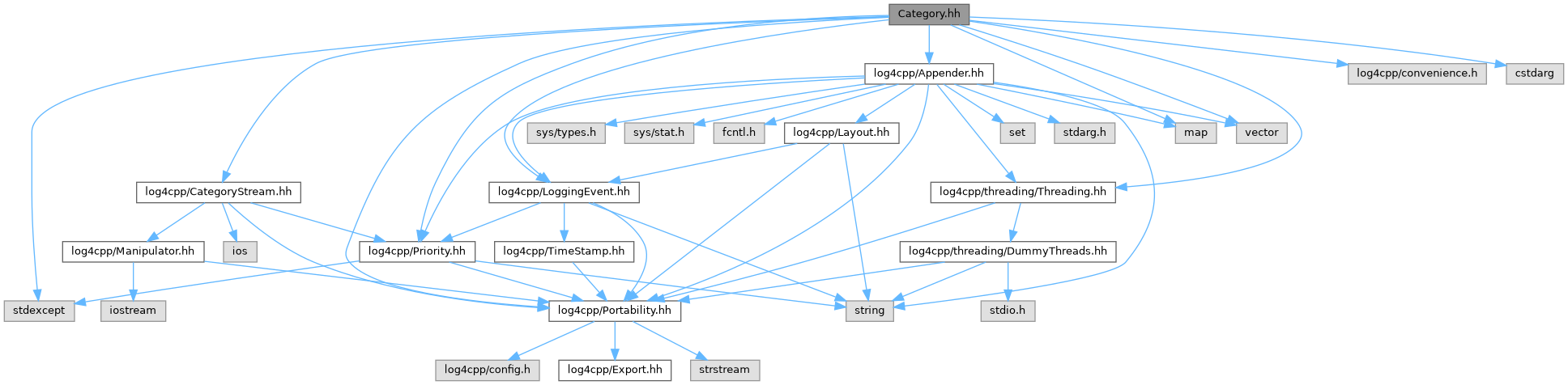 #include <log4cpp/Portability.hh>#include <log4cpp/Appender.hh>#include <log4cpp/LoggingEvent.hh>#include <log4cpp/Priority.hh>#include <log4cpp/CategoryStream.hh>#include <log4cpp/threading/Threading.hh>#include <log4cpp/convenience.h>#include <map>#include <vector>#include <cstdarg>#include <stdexcept>